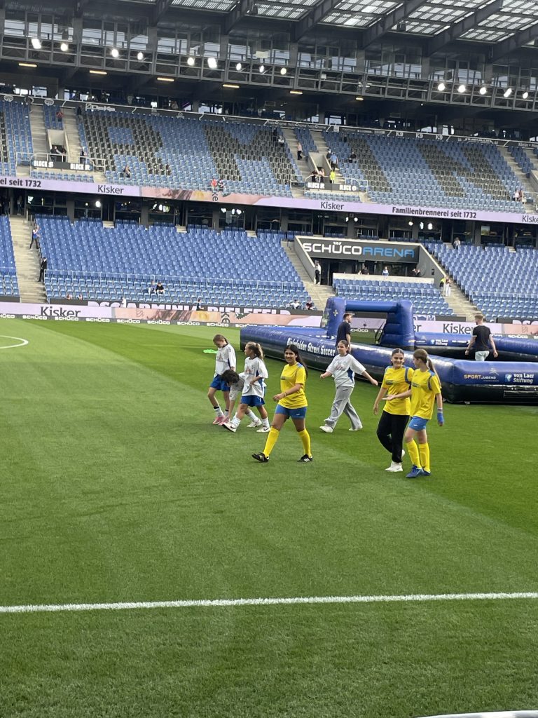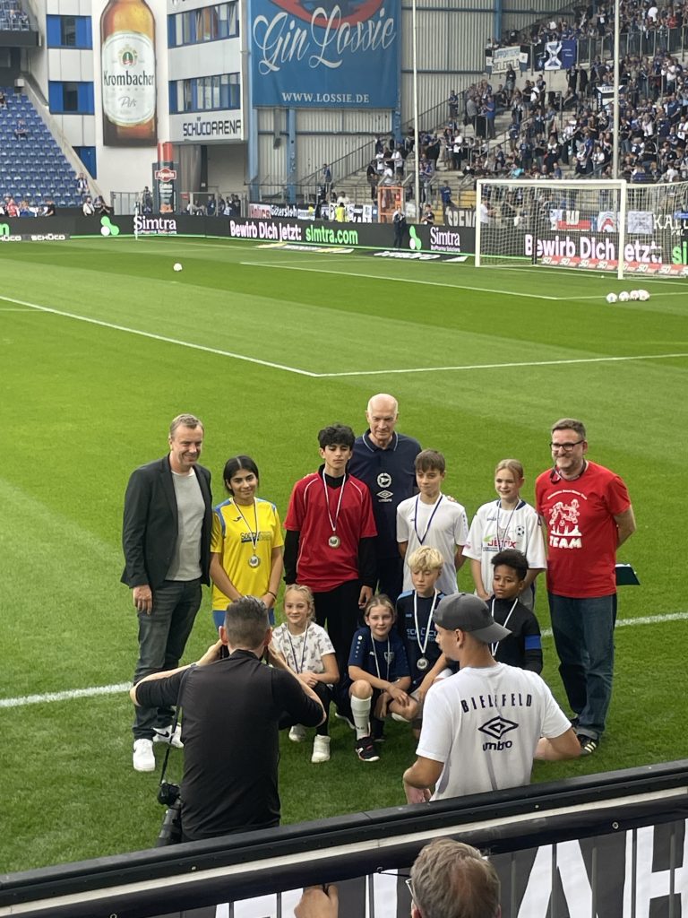 Am vergangenen Samstag (13. September) traten sie dann gegen die anderen Siegerteams der Bielefelder Schulen an. Auch dort überzeugten sie deutlich und gingen als Siegerinnen hervor. Als Belohnung durften sie am Freitag vor dem Spiel der DSC-Profis auf dem heiligen Rasen im Stadion das Endspiel gegen die Realschule Jöllenbeck austragen. Mit einem spektakulären Siegtreffer durch Alicia sicherten sich die Mädchen so zum zweiten Mal in Folge die Goldmedaille.